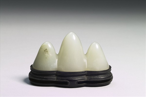 玉質,局部有灰斑,玉質有綹。器呈山形,造形為連綿的三座山峰。附木座,底陰刻填金楷書一「乙」字。