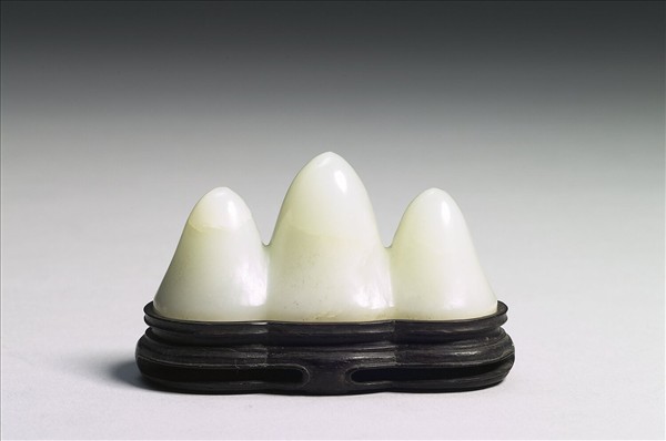 玉質,局部有灰斑,玉質有綹。器呈山形,造形為連綿的三座山峰。附木座,底陰刻填金楷書一「乙」字。