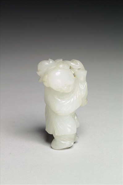 玉質。立雕一站立童子,頭綁雙髻,頭微彎,雙手捧瓶,瓶中蓮花靠於童子肩後。瓶上方有一小孔,用途不明。