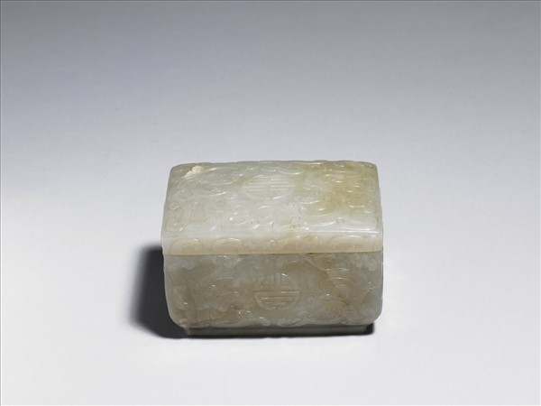 玉質,有綹及璺。全器呈長方形平頂蓋、直壁、有圈足。蓋面與器壁的紋飾相同,為卷雲紋中央飾有團「壽」字。盒底有款「宣和」二字篆書,盒蓋內有貼黃籤:「玉字一百六十一號」