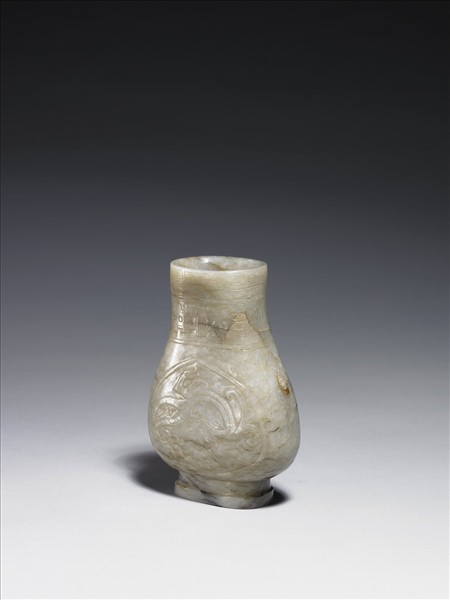 玉質,玉質有綹及赭璺。器形為壺式扁瓶,寬頸、垂腹、有圈足。口沿一周回紋,頸飾夔龍紋,腹部開光內陰刻一團龍紋。另一面為鳳紋。