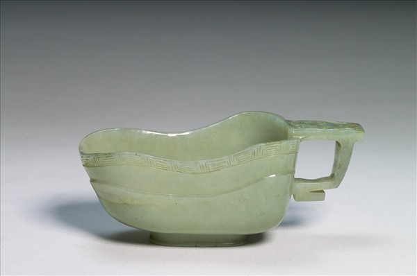 玉質,有綹及璺。全器略呈方形,鋬帶垂珥,有圈足。口沿有回紋一周。鋬上雕飾獸面紋。