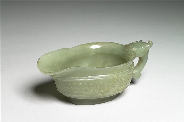 玉質,有綹及璺。匜身呈橢圓形,鋬帶垂珥,作立雕獸首,口沿稍外侈,有圈足。腹飾乳丁紋。