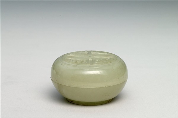 玉質,玉色泛黃有璺。器形為平頂圓盒帶蓋、弧形壁、有圈足,蓋與器身略相等。蓋面飾團壽字。