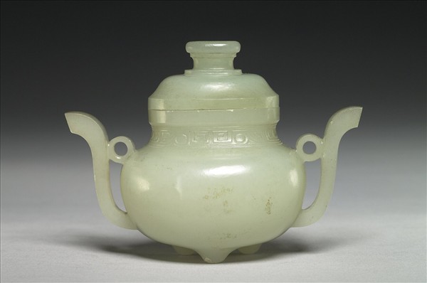 玉質。長耳香爐,附鈕蓋,二外撇立耳,圓腹,三小足。頸部飾幾何紋。