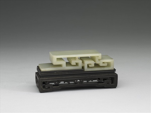 玉質,玉色泛黃,器身有璺。全器作變化式回紋,平頂式可放置墨錠。附鏤雕長方形木座。