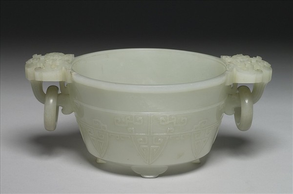 玉質,雕一圓口筆洗,雙耳附環,底琢四足。耳飾如意雲頭紋及花卉紋,腹飾弦紋及三角紋,內填勾連雲紋。