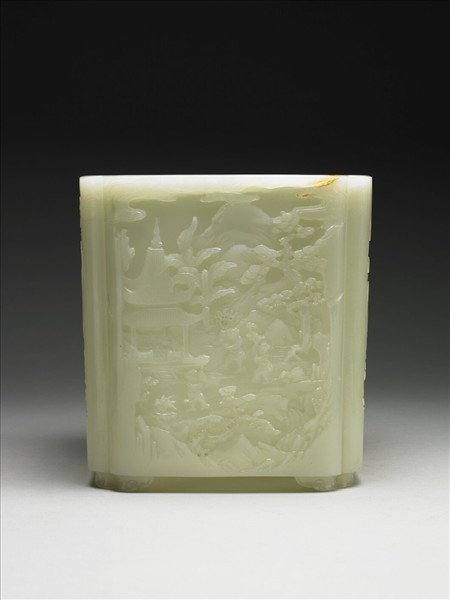 玉質。四面均去地深雕嬰戲圖,十餘童子於松木、涼亭間玩耍,或燃爆竹、或提燈,氣氛輕鬆、愉悅。