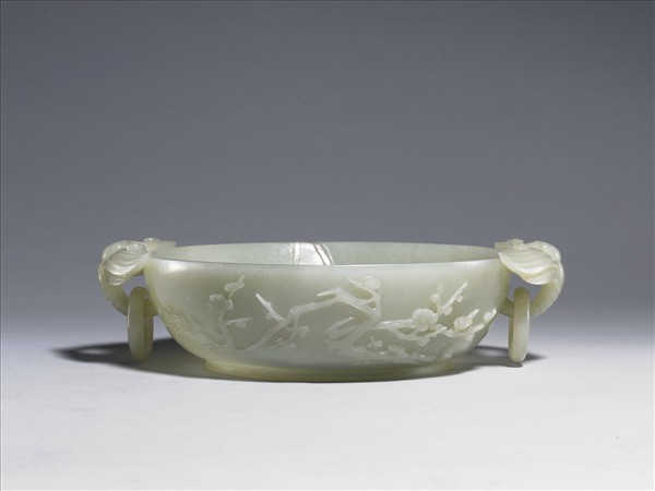 玉質,雕一圓形筆洗。敞口,淺腹,矮圈足,腹側蝶形耳,附環。器壁浮雕桃枝、老幹、梅花,器心淺雕蔓草、鯰魚。