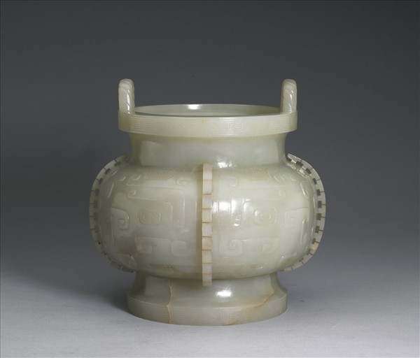 玉質圓爐,盤口、立耳、短頸、鼓腹、圈足,腹有稜脊。口沿、足緣均飾回紋,腹飾獸面紋,耳琢紐絲紋。外底心刻「大清乾隆仿古」隸書款。