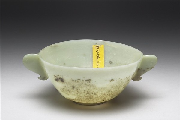 玉質,青色,有深色及白色斑點。碗,侈口,深腹,圈足,兩側有一對耳朵形把手。把手造型有伊斯蘭玉器風格。
