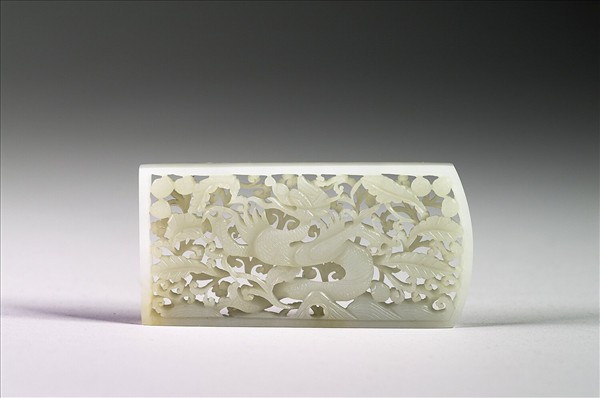 故玉3477-3496共二十件帶版為一套。白色玉質,質地純淨。雖然形制略有不同,但題材皆相同,主體為一昂首魚龍,足爪大張,尾轉如魚;魚龍以下方的山崖為平衡支點,靈動身軀自海水騰飛而起;魚龍兩側則填飾花果紋和卷雲錦地。這些紋樣以多層次鏤空的技法創造出前後交疊的空間感,整體予人繁複華麗的視覺效果;至於葉片中央的葉脈,則以縱直深長的琢磨方式呈現,表現出飽滿的張力。