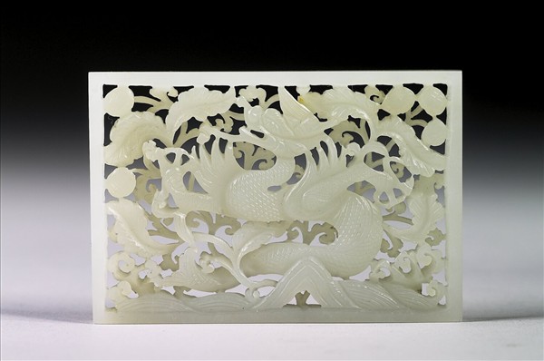故玉3477-3496共二十件帶版為一套。白色玉質,質地純淨。雖然形制略有不同,但題材皆相同,主體為一昂首魚龍,足爪大張,尾轉如魚;魚龍以下方的山崖為平衡支點,靈動身軀自海水騰飛而起;魚龍兩側則填飾花果紋和卷雲錦地。這些紋樣以多層次鏤空的技法創造出前後交疊的空間感,整體予人繁複華麗的視覺效果;至於葉片中央的葉脈,則以縱直深長的琢磨方式呈現,表現出飽滿的張力。