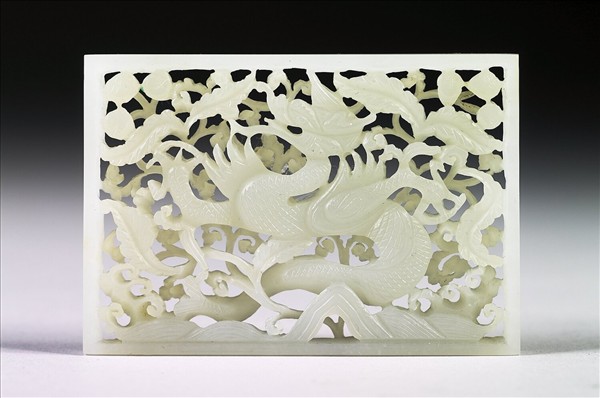 故玉3477-3496共二十件帶版為一套。白色玉質,質地純淨。雖然形制略有不同,但題材皆相同,主體為一昂首魚龍,足爪大張,尾轉如魚;魚龍以下方的山崖為平衡支點,靈動身軀自海水騰飛而起;魚龍兩側則填飾花果紋和卷雲錦地。這些紋樣以多層次鏤空的技法創造出前後交疊的空間感,整體予人繁複華麗的視覺效果;至於葉片中央的葉脈,則以縱直深長的琢磨方式呈現,表現出飽滿的張力。