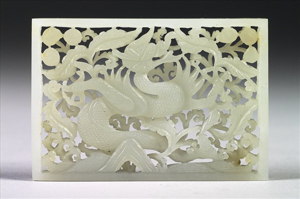 故玉3477-3496共二十件帶版為一套。白色玉質,質地純淨。雖然形制略有不同,但題材皆相同,主體為一昂首魚龍,足爪大張,尾轉如魚;魚龍以下方的山崖為平衡支點,靈動身軀自海水騰飛而起;魚龍兩側則填飾花果紋和卷雲錦地。這些紋樣以多層次鏤空的技法創造出前後交疊的空間感,整體予人繁複華麗的視覺效果;至於葉片中央的葉脈,則以縱直深長的琢磨方式呈現,表現出飽滿的張力。