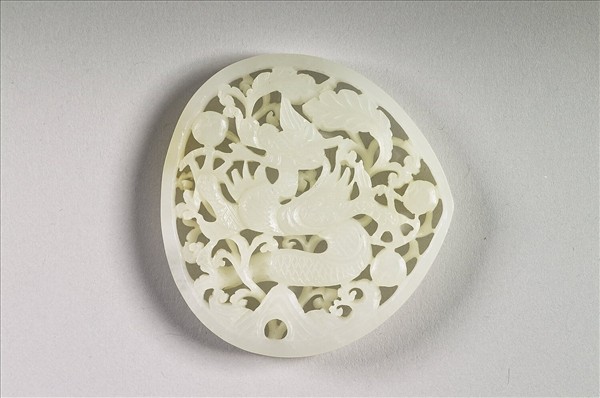 故玉3477-3496共二十件帶版為一套。白色玉質,質地純淨。雖然形制略有不同,但題材皆相同,主體為一昂首魚龍,足爪大張,尾轉如魚;魚龍以下方的山崖為平衡支點,靈動身軀自海水騰飛而起;魚龍兩側則填飾花果紋和卷雲錦地。這些紋樣以多層次鏤空的技法創造出前後交疊的空間感,整體予人繁複華麗的視覺效果;至於葉片中央的葉脈,則以縱直深長的琢磨方式呈現,表現出飽滿的張力。