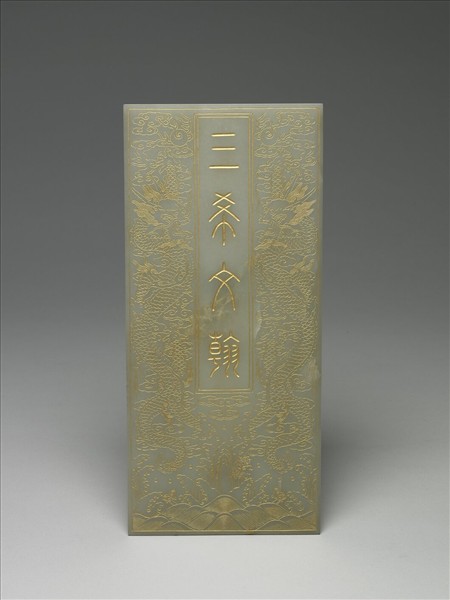 全器為長方片狀,共四片。第一片封面陰刻填金方框篆書「三希文翰」,左右飾雙龍,下飾福山壽海。背面為三希文翰及詩文二行。合儲於錦匣內。