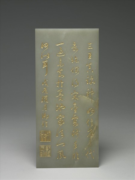 全器為長方片狀,共四片。第四片正面陰刻詩文及二印。封底飾正面龍紋,下飾福山壽海。合儲於錦匣內。