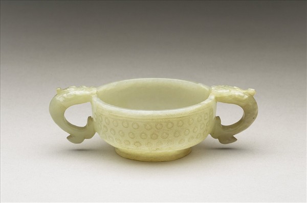 玉質。圓口、獸耳、圈足。腹飾陰刻圓圈紋。與故玉3503成對。