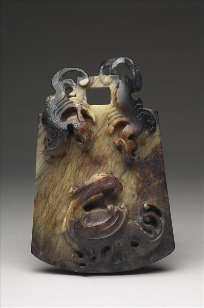 玉質,玉色白泛黃,帶有大半深褐或黑沁色。全器呈片狀,似仿青銅鐘形,一面作高浮鳳鳥三隻,背面以細線陰刻太極、乳丁與蕉葉紋。有錦袱,收納於表錦木匣內。錦袱,作淺灰底藍色如意雲頭形團花圖樣。裱錦木匣,作褐色幾何圖案錦地,及六瓣雲頭紋與卍字。