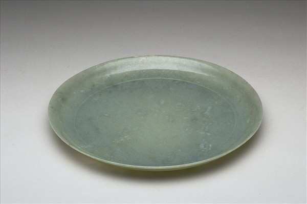 玉質,玉色青灰,帶有灰赭斑。口略外撇,弧形淺壁,有圈足。