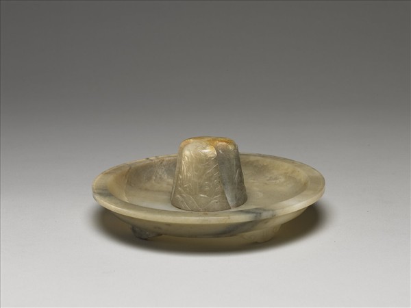托盤中心雕一突起柱狀,三個凹槽以托爵之三足,口有折邊,底有三小足。與故玉3521玉爵一對儲於錦匣。