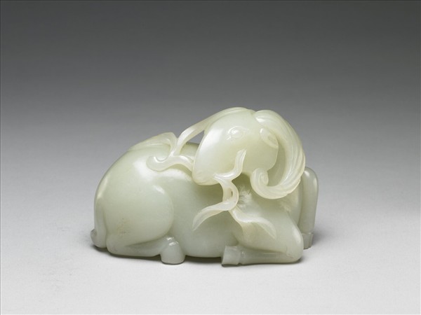 玉質,玉色白略泛青。全器雕作一山羊,做回首趴伏姿態,口啣草葉。山羊角長並圓捲。附木座、錦袱,收納於裱錦木匣內。湖石花卉木座。木座鏤雕作湖石,間有花卉草葉及果實。錦袱,作黃色底,粉紅色與淺藍色側面帶枝葉圖案花卉。裱錦木匣,略有破損。作橄欖綠色地白色提花,提花圖案作連續的平展五瓣花。