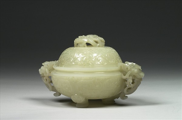 玉質,雕一帶蓋圓爐。子母口,獸首耳,圓腹,三獸足。蓋頂鏤雕蟠龍鈕。蓋面、器腹飾獸面紋。