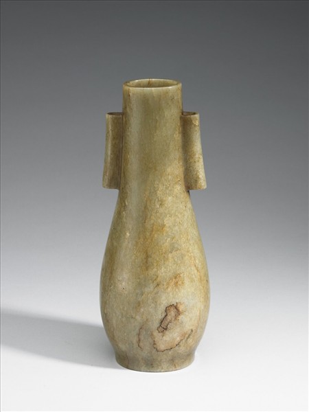 玉質,雕貫耳瓶。圓口,直頸,貫耳,腹微鼓,平底。