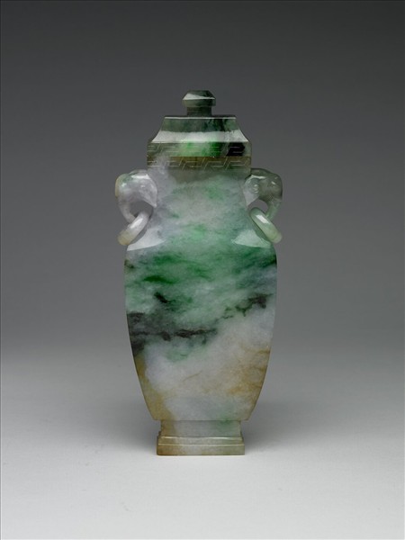 翠玉質,雕帶蓋扁方瓶。方口,斜肩,雙環耳,方圈足,附鈕蓋。蓋沿、口沿均飾陰刻幾何紋,耳飾象首。