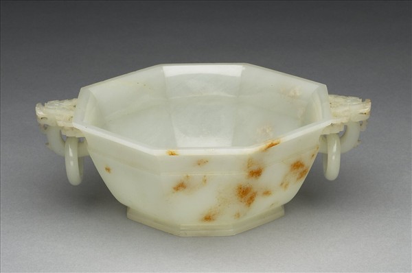 玉質,器身有璺,雜赭斑。口呈八角形,微侈,深腹、龍首耳附環、平底、圈足。