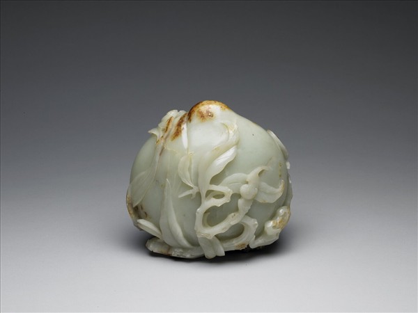 玉質,有璺、雜赭斑。全器以桃實為形,滿附枝葉,造型寫實。
