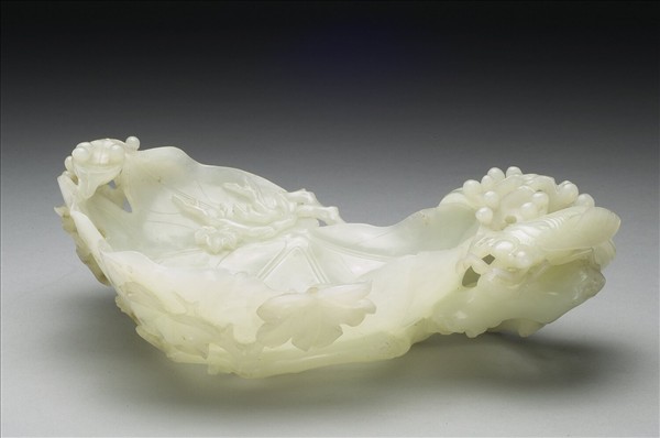 玉質,色白潤微青,邊緣有青綠瑕斑。全器雕作一梧桐葉形,邊緣還鑽有數小孔。葉脈清晰,邊緣上捲,兩側及葉底又琢成梧桐莖葉及露珠,一隻秋蟬停憩於上。