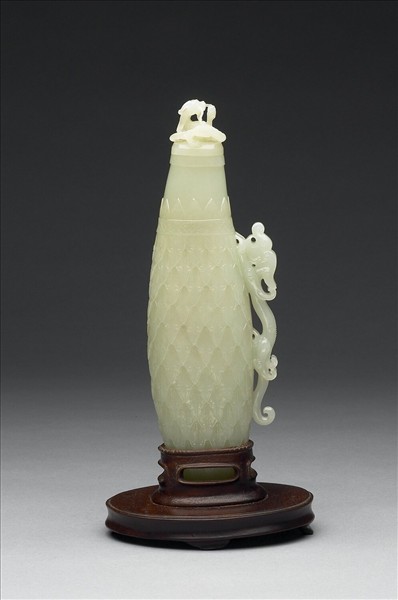 玉,子母蓋、圓口、圈足。蓋鈕為立雕盤龍,腹細長,飾三角紋及葉紋,側出一龍形鋬,足飾綯紋。外底有「乾隆年製」隸款。附木座及錦匣。