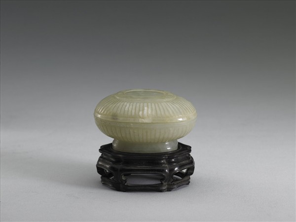 扁圓形盒,有圈足。蓋頂飾回紋一周,蓋緣琢直棱紋,盒壁亦琢直棱紋。附木座,底標有「乙」字。