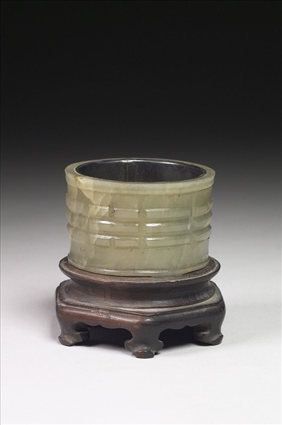 玉質,圓筒形,內有膽,三足。器壁琢八卦紋飾。附木座。