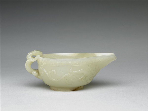 玉質。器仿青銅匜,有把,有流,有圈足。口緣琢回紋一周,單耳雕作攀螭,器外壁另浮雕一螭紋。
