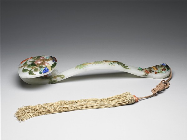 白玉如意,上嵌瑪瑙、碧璽、松石、青金石等,為桃、蝠、松、竹、靈芝等。如意頭與柄之間琢一猴。帶絲穗,穗上有珊瑚珠二。