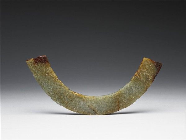 器形如虹,而在兩端有方形的齒稜(上方四齒;下方三齒)。一般認為,這些齒稜即是早期龍紋璜上,龍鼻、角、口、頦等部位的簡單化與幾何化。器表則滿佈由龍紋解體、分化而成的雲紋與穀紋,排列甚為緊密。上方正中有一小孔。