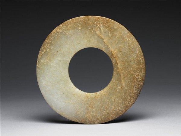 玉質,半透明;全器的三分之二,由外緣向內分布密集的褐、白絲紋沁,部分蝕化。圓整,肉面微鼓,內稍厚,外緣稜磨渾了;中孔鑽作平整且磨飾圓滑;外緣亦磨飾圓滑。表面光素溫潤。