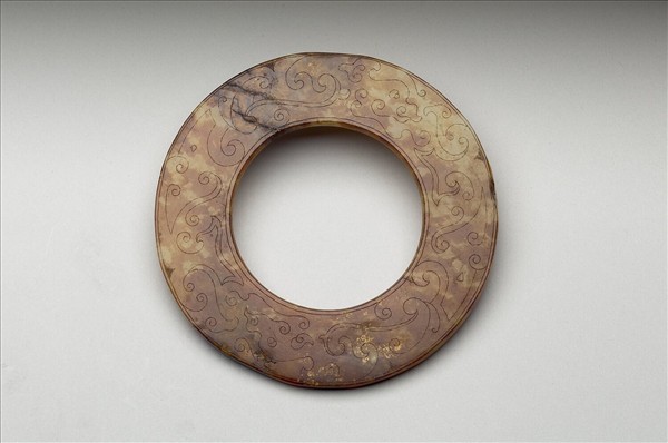 圓瑗形,厚薄不勻,器緣陰刻有廓,雙面均以陰刻飾以雲氣紋,為明晚期至清早期後加。