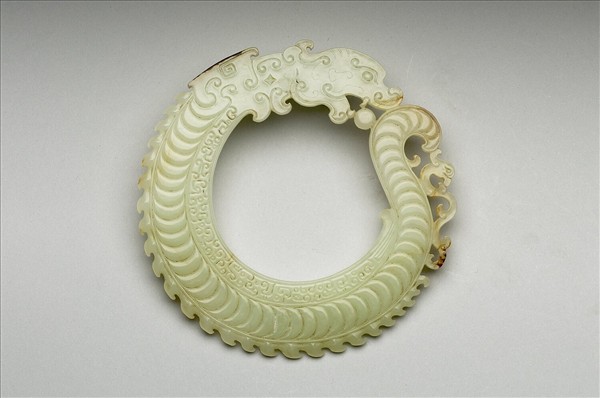 圓瑗形,有璺。全器飾以龍紋,龍首銜珠,尾附鳳紋,首尾相連。