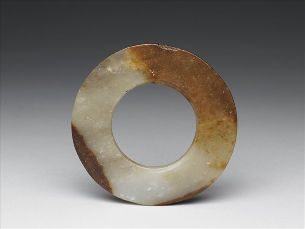 圓璧形,器緣有傷。器面兩端出現糖包白玉料的規律性變化,呈色極深,玉質溫潤泛光澤。另附圓盒,內儲梳妝器。