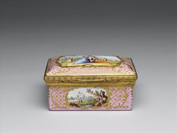 銅胎畫琺瑯掀蓋盒二件(故玉3612與故玉3649附件),皆以粉紅色地渦捲描金裝飾,四周開光繪風景畫,一件盒蓋繪河岸風景畫,另一件繪貴族男女漫步庭園中,口緣鑲雕花鍍金銅口。依其形制與裝飾風格,應為十八世紀後半英國Battersea式琺瑯。