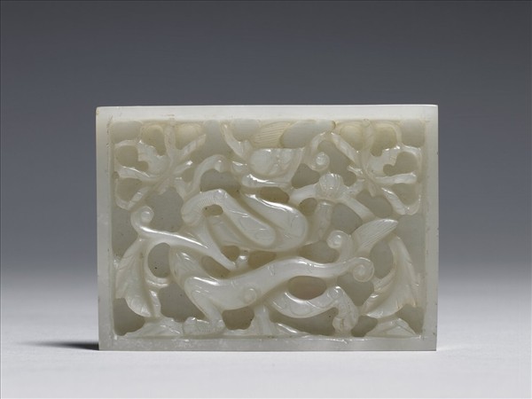 玉質。器作長方形,正面為雙層鏤雕之龍紋與花葉,龍前足抓著花莖,身軀穿梭於花叢中。背面有四象鼻穿。附卷草雕花木架。原為腰帶上的裝飾玉板,清代改作為書齋中擺設之用的插屏。