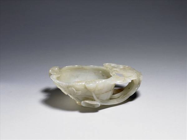 玉質,色帶灰。全器作一枯荷,葉向內卷而成洗,器外壁滿布淺浮雕葉脈,有一蒂,自底心伸出與枝梗相連而成器耳,莖上有遊魚,耳為葉柄作成,鏤空浮雕蓮花,荷葉、枝梗,口緣處並有蓮蓬、蓮花及慈菇。