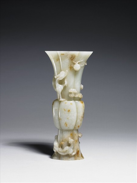 玉質,有綹,器表局部刻意作色。全器呈四瓣海棠花形,器作三段,脰部高浮雕龍戲珠,足部則飾螭獸,並間有卷雲。