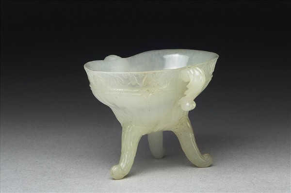 光潔的白玉雕琢一模仿中國在商周時期銅爵造形的小杯子,但口沿雕一週下垂的小花,雙柄鏤雕成捲葉形。從器底中心琢一罌粟花,四片寬花瓣向上包於器壁與三足上。盛裝這件玉杯的繡花回子布套上,綁縛清宮黃籤,載「嘉慶二十二年(1817)七月初十日喀什噶爾呈進□玉週身花小爵盃一個」第17字模糊不清,可知此器是1817年自新疆的喀什貢入。從細密精美的雕工觀察,此應出自印度玉工之手。可能是為了外銷中國而設計中國的造形。