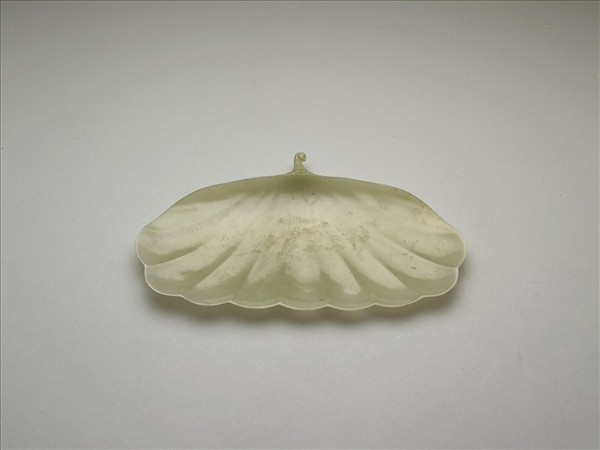 黃灰色玉,雕一寬葉,葉莖呈放射式。柄端雕成捲葉。
