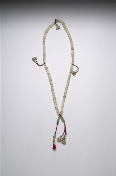 深淺不一的青白玉,雕琢大小不甚一致的瓜形圓珠,主要的部份共100粒串連而成。又用絲穗將之分為四段,各有24、25、24、27粒。這樣瓜瓣稜稜的玉珠串成的念珠,在印度中南部沙拉金博物館(Salar Jung Museum)展出二串。分別為97粒、101粒。從顆粒數及分組的情形看,本院以及沙拉金博物館的三串,都與今日伊斯蘭教使用99粒的念珠制度不合。本院這串從絲穗觀察,可能是到了清宮後,重新穿繫的。